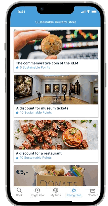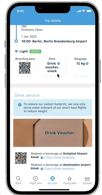 To reduce the flight's carbon emissions, we will only serve the water on board. The drink voucher will also show in the app, and the user could use it to redeem a cup of drink in any kiosk shop at the Schiphol airport or destination airport.